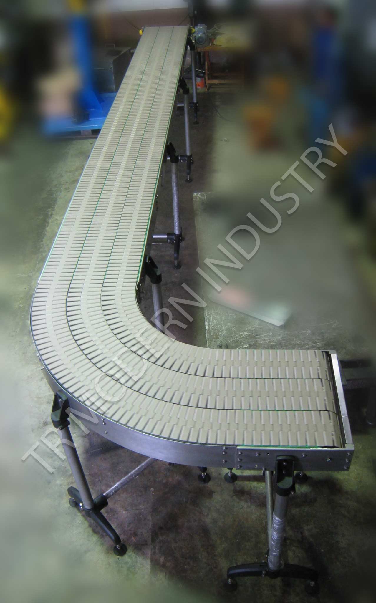 1. Top Chain Conveyor: ระบบลำเลียงที่ใช้สายพานโลหะที่มีลูกล้อบนพื้นที่สำหรับลำเลียงสินค้าหนักหรือในรูปแบบเชื่อมต่อเป็นสายเดียวกัน